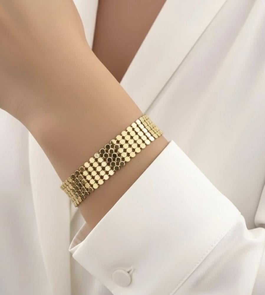 تميّز بإطلالة راقية مع هذه الإسوارة الفاخرة، مطلية بالذهب اللامع بتصميم مسطح مستوحى من شكل العملات الدائرية الصغيرة، تعكس الضوء بشكل مبهر وتضفي لمسة فخامة فريدة. مزودة بقفل محكم وعملي يمنحك ثقة وأناقة في كل مناسبة. خيار مثالي للإهداء أو لإكمال اللوك اليومي بأسلوب جذاب وعصري.