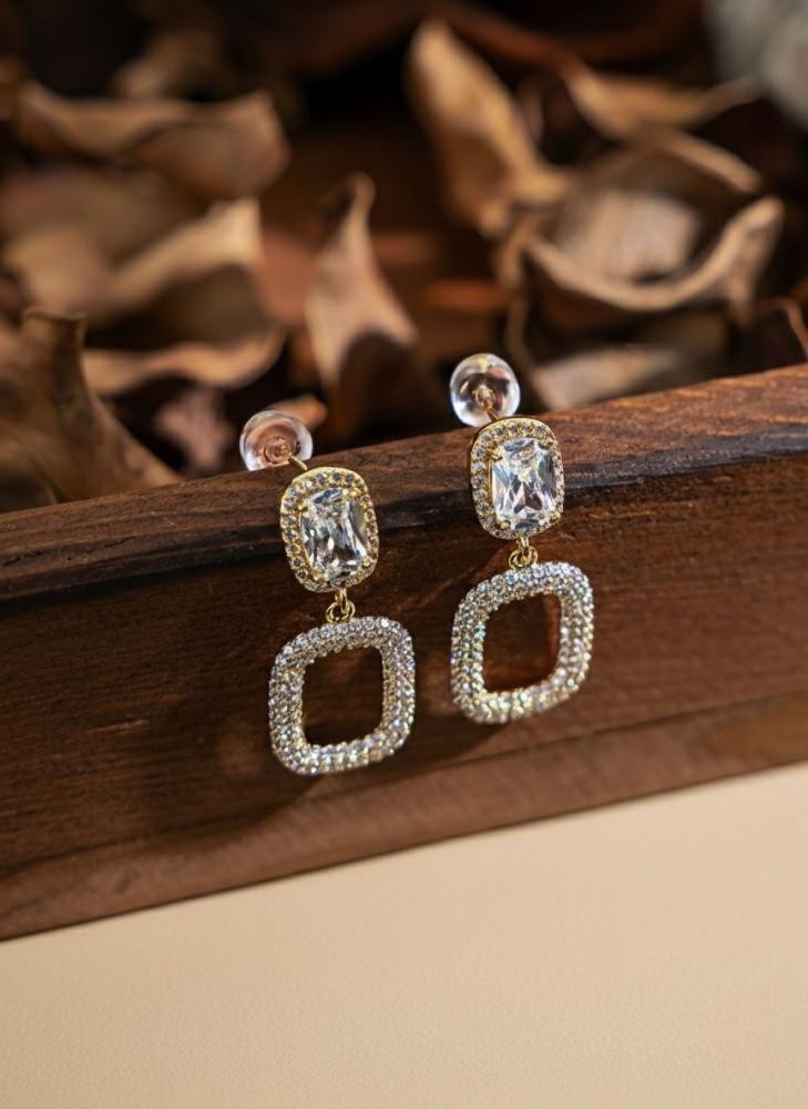 يتميز بتصميم أنثوي فخم، حيث تتوسطه حبة زركون كبيرة لامعة تضيف لمسة من الفخامة، ويتدلّى منها مربع مغطى بالكامل بحبيبات الزركون البراق ليعكس الضوء بجمال آسر عند كل حركة.