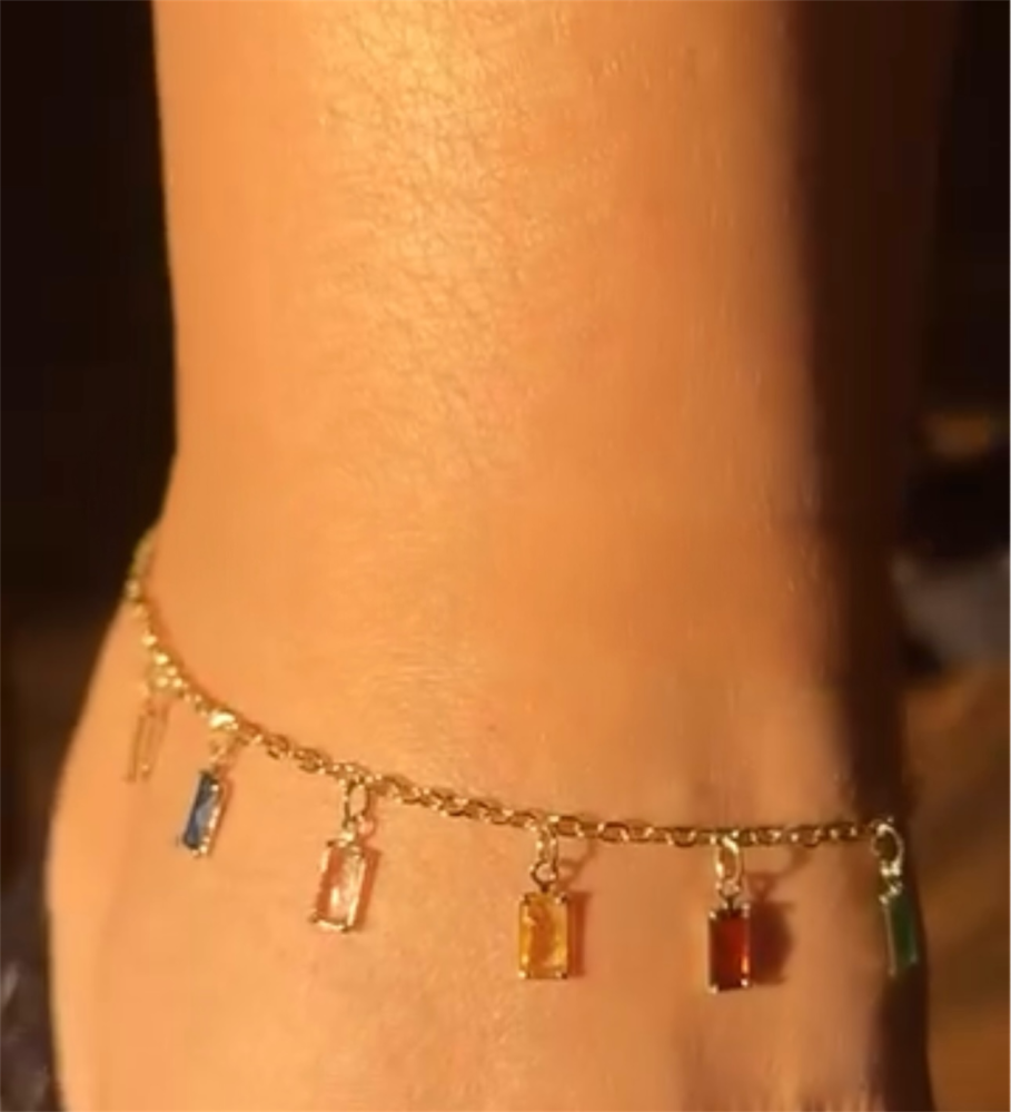 خلخال ذهبي مطلي ذهب بجودة عالية رقيق مزين بأحجار مستطيلة ملونة بألوان زاهية ملونة، يضيف لمسة من الأناقة والجاذبية على الإطلالة، مثالي للمناسبات الصيفية والإطلالات العصرية.