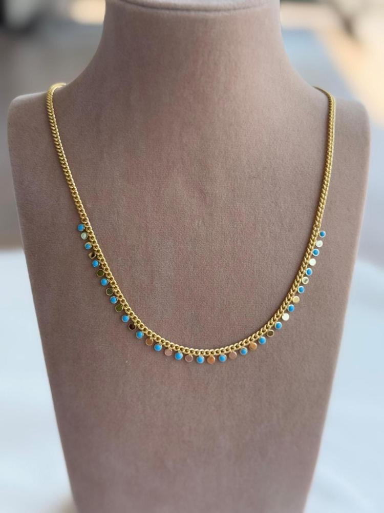 سلسال قصير ناعم مطلي ذهب عيار ١٤ مع تعليقات دائرية بلون ذهبي وتركواز.