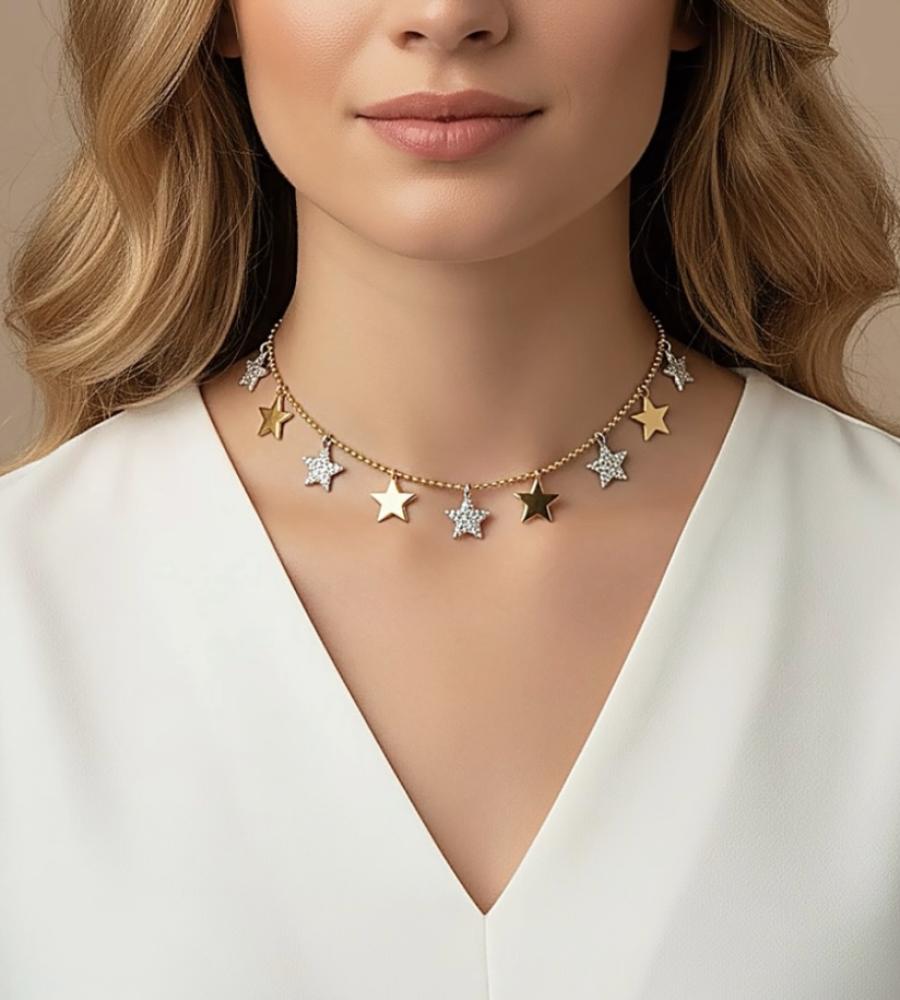 شوكر أنيق بتصميم عصري ومميز، حيث تتألف من سلسلة رفيعة مرصعة بتعليقات على شكل نجوم صغيرة. النجوم تأتي بتصميم مزدوج، بعضها مصنوع من الذهب المطلي اللامع، بينما البعض الآخر مرصع بزركون البراق، مما يضيف لمسة فاخرة ومتألقة. الشوكر يتميز بأسلوب ناعم وأنثوي، وتتناسب مع الإطلالات الأنيقة والكاجوال، مما يجعلها قطعة مثالية للإكسسوارات اليومية أو المناسبات الخاصة.