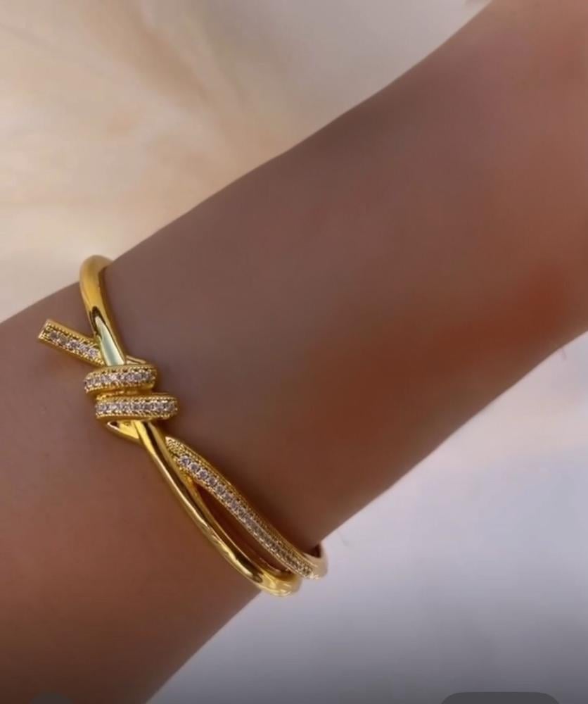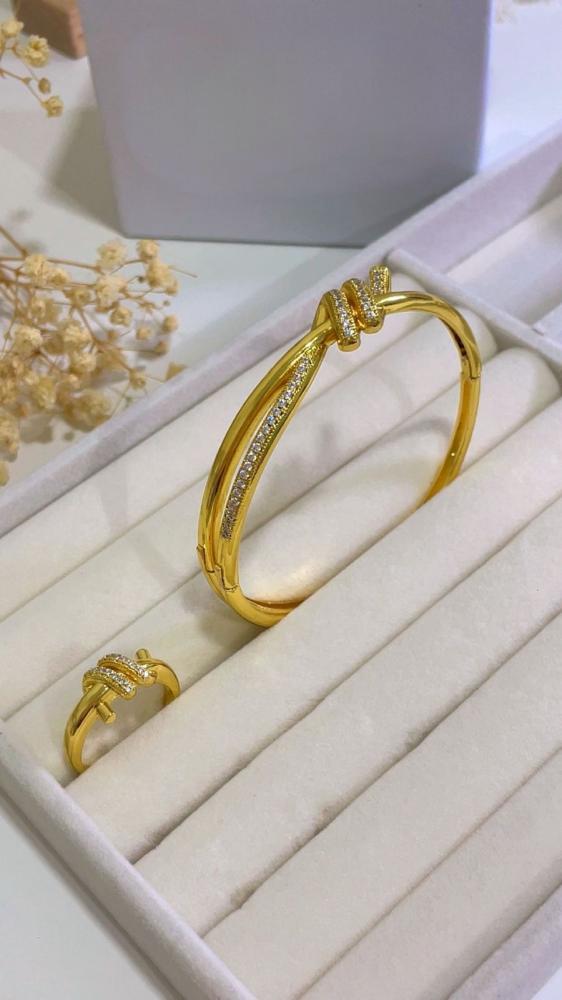 طقم اسوارة مع خاتم مطلي ذهب عيار 18 مستوحى من ماركة عالمية، بتصميم عقدة عصرية مرصعة بزركون لامع.