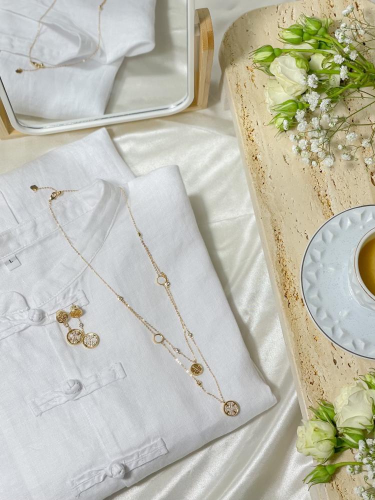 - يتميز هذا الطقم أنه يضم سلسلة متعددة الطبقات متناسقة مع أقراط ناعمة ليُكمل إطلالتك بتناغم مثالي.