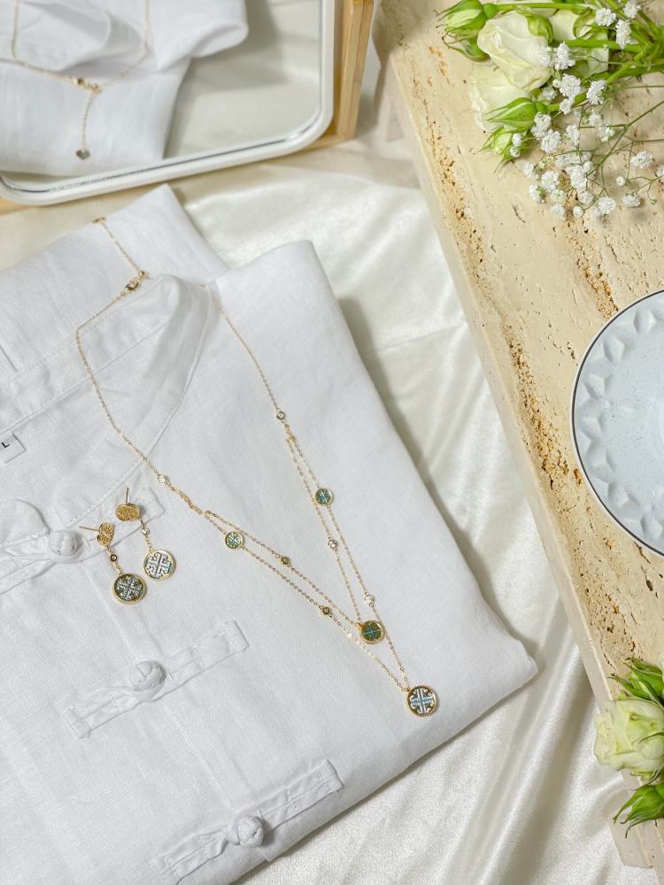 اختاري الجمال والراحة في كل طلعاتك مع طقم داماس انيق مطلي ذهب عيار 18، ويأتي هذا الطقم بتصميم عصري وراقي ويضم هذا الطقم سلسلة طويلة بطبقات متعددة مزينة بدوائر صغيرة، بتفاصيل دقيقة تجمع بين الألوان الساحرة من الزمرد والأزرق الفيروزي مع لمسات لامعة تُضفي لمسة فخامة استثنائية، وتأتي الأقراط الناعمة متدلية بتصميم متناغم مع السلسلة تبرز النقوش الهندسية الفريدة المحفورة بدقة.