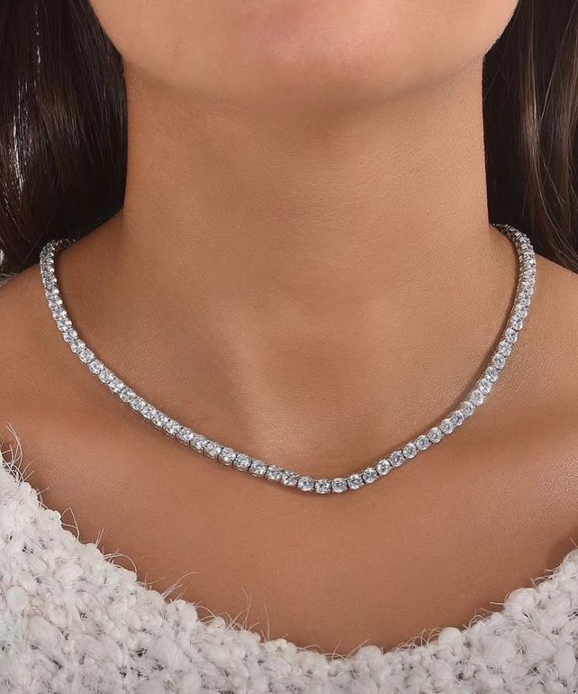 • العقد: يتميز بتصميم بسيط وراقٍ، مرصع بالزركون البراق متراصة بإحكام على طول السلسلة .. مما يمنحه لمعانًا جذابًا حول الرقبة.