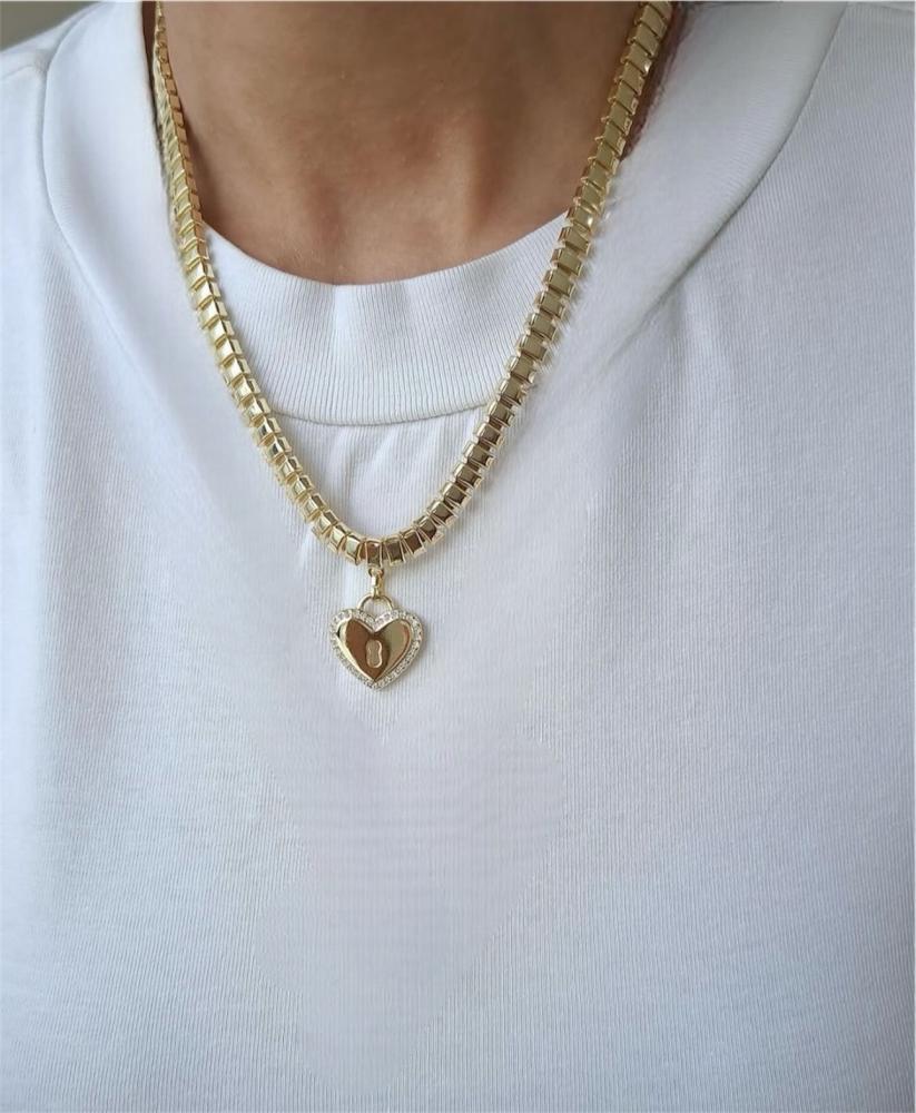 قلادة ذهبية بتصميم أنيق، تتكون من سلسلة عريض مربعة الشكل مع قلادة على شكل قلب مزينة بالزركون البراق وتفاصيل أنيقة.