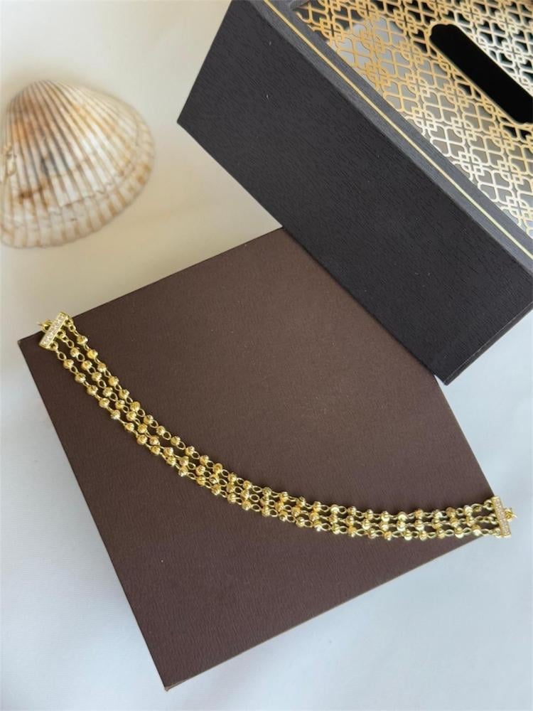 بتصميم ثلاثي الطبقات المتداخل، يتميز هذا السوار بكرات ذهبية متراصة تضيف لمعانًا وأناقة ملفتة على المعصم.