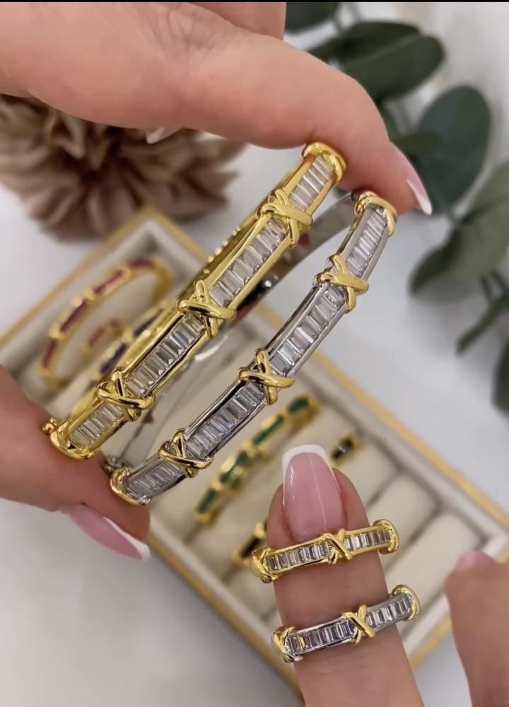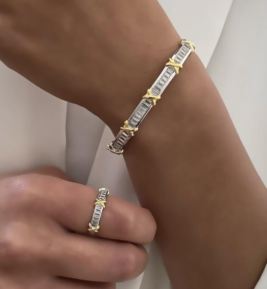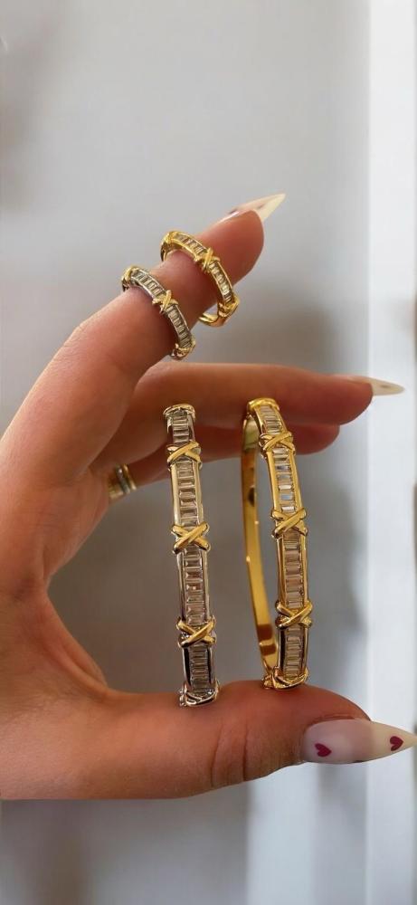 هذا الطقم الفاخر يتكون من سوار وخاتم بتصميم أنيق يجمع بين الذهب الأبيض والأصفر المطلي بجودة عالية بماء الذهب ..