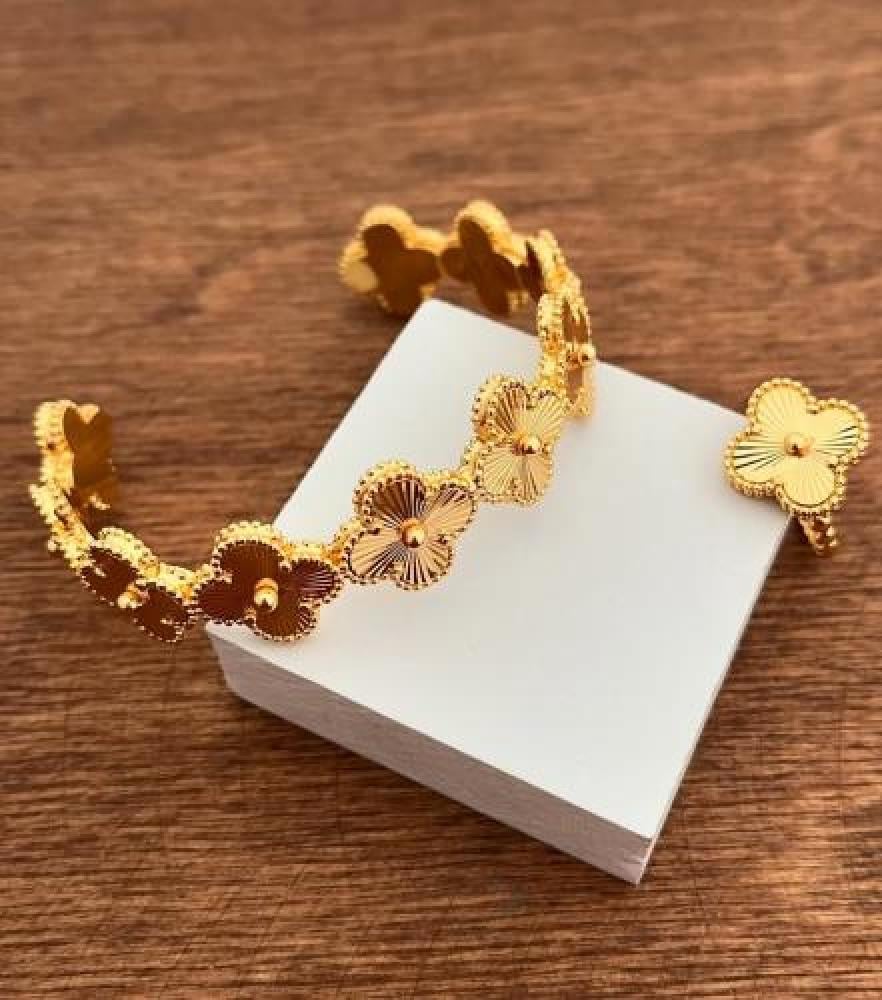 طقم مطلي بجودة عالية بماء الذهب أنيق مكون من إسوارة وخاتم بتصميم مستوحى من الزهور، مصنوع من مواد عالية الجودة بنقوش دقيقة تضيف لمسة فاخرة. يتميز السوار بتصميم مفتوح مرصع بزهور متصلة، بينما يعكس الخاتم نفس الطابع الأنيق بتصميم زهرة واحدة.